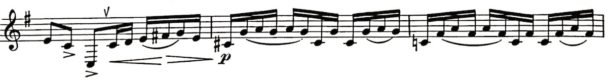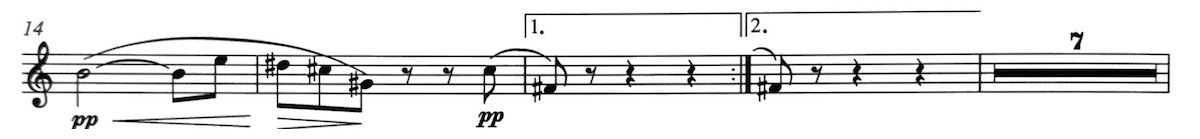 In the second and third measures below, I was losing tone focus. The problem was that my bottom lip was sagging, just a bit, with each downward dip to C♯ or C. Once I started using the corners to stabilize the bottom lip, tone focus improved.